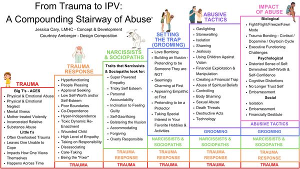 The IPV Stairway illustrates the trajectory of abuse — from developmental trauma to finding yourself in an abusive relationship. It forms the roots of the Healing Tree and traces the steps many survivors have unknowingly walked, leading them into the arms of their abuser(s).